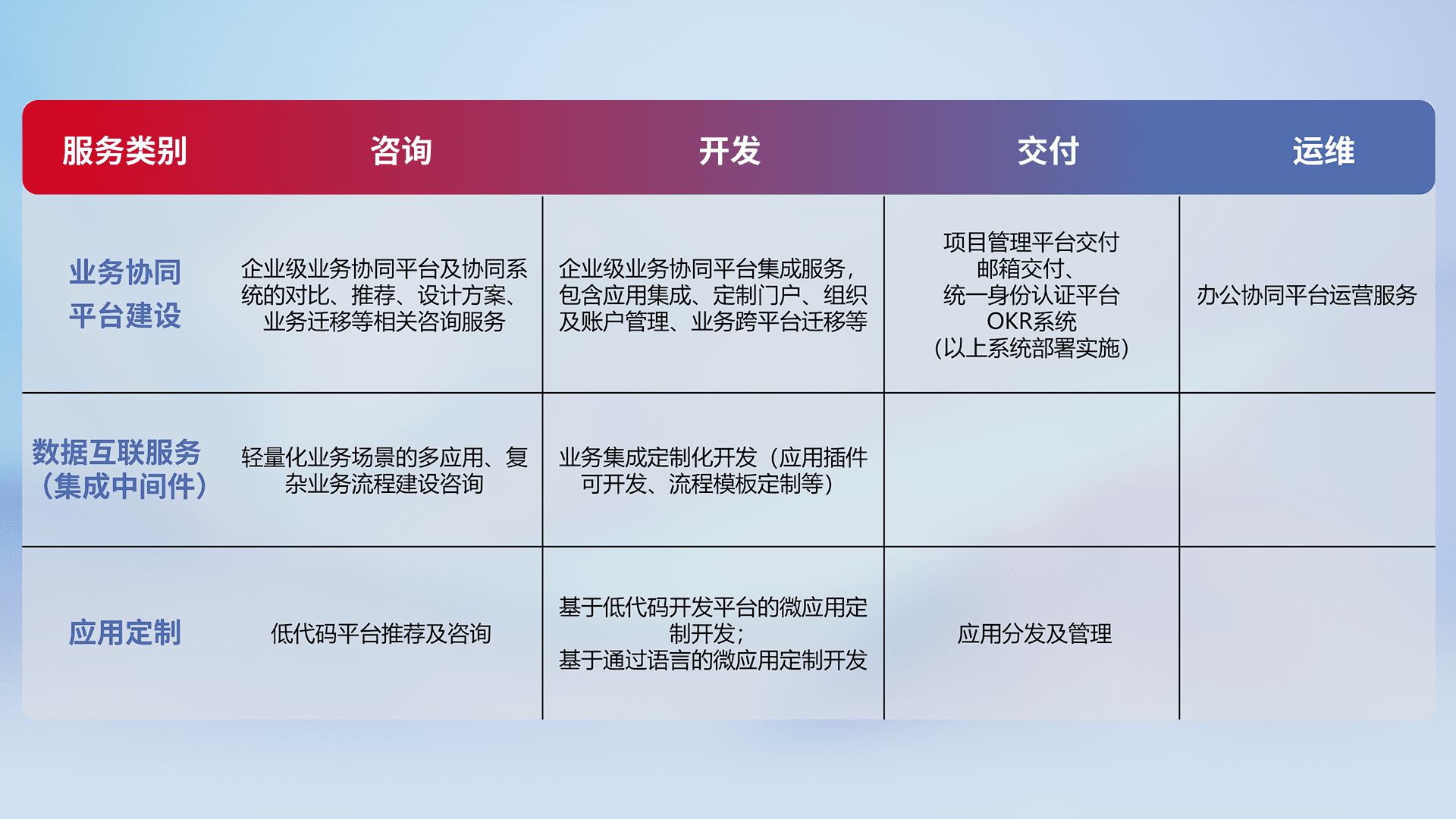 针对钉钉、、企微、、IDaas等平台级产品提供产品的规划、、方案、、、、交付、、定制化开发等服务,,,实现如统一协同办公、、智能客户服务、、混合会议管理、、、智能数据查询、、、、等业务场景,,,实现数字化转型。。。