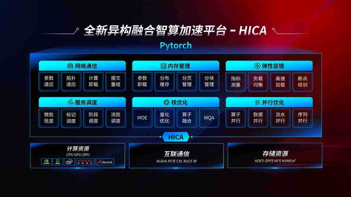通过自研的服务层、、中间适配层、、、、以及调度编排算法,,,,采用数据并行、、、、模型并行等多种并行方式,,,把并行计算任务进行有效的分解,,使其分别由相应的软件栈和算力资源来承接。。。当GPU资源变化,,,,HICA可以实时动态调度计算子任务并调整模型拓扑和架构,,以充分聚合各种算力资源。。。