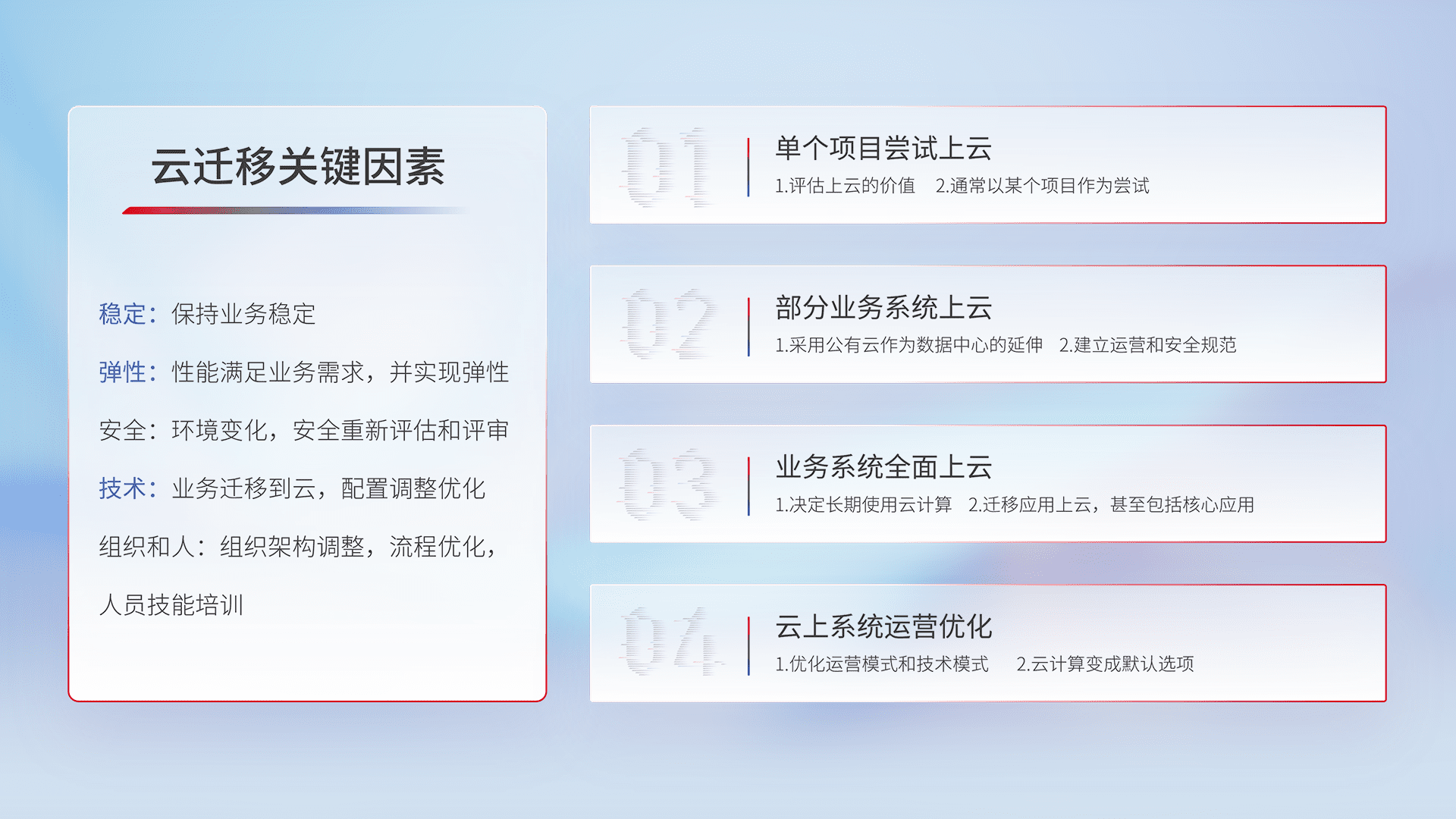 结合实际业务,,从规划设计、、、云平台选型、、云原生改造、、、、数据迁移、、、、集成交付,,,,迁移全过程为客户识别最佳上云路径,,做好风险识别管理,,,设计网络架构、、、身份权限、、安全审计合规、、操作审计、、、日志审计、、监控告警策略、、、、多站点容灾设计等,,,,对云上基础设施进行整体规划,,,,提升IT治理水平,,以满足弹性、、、高可用、、、、高性能的需求。。