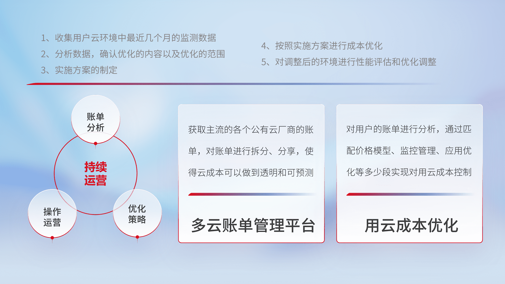 通过多云纳管,,,,以统一的资源数据模型把客户的云资源进行抽象和封装,,进而实现对多云资源的统一操作,,,保障云资源管理的可靠性、、、稳定性与可用性。。。。量身定制化运维内容,,配置、、、开发运维、、、补丁管理、、、备份、、、、监控、、、、认证和访问管理、、、、审计和日常巡检等,,保障在用云过程中的可靠度,,,稳定度以及高可用率。。。。