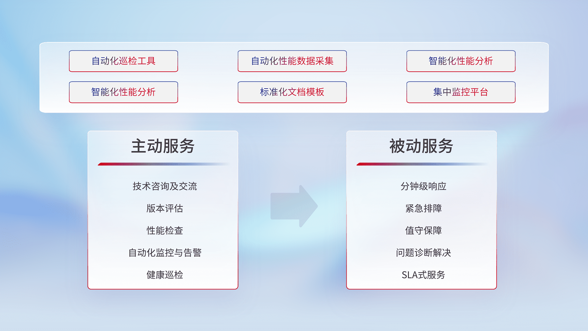 智能化工具和标准化文档,,,保障服务质量,,提供主动服务(包含技术咨询、、、、版本评估、、、性能检查、、、、自动化监控与告警、、、、健康巡检)和被动服务包含(分钟级响应、、、紧急排障、、、值守保障、、、、问题诊断解决、、、、SLA服务)。。。